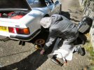 And here is that photo! Note the safe and sterile work environment and the wide range of tools on show. Note also the limited extent of fat carcass that fits under the car, even at that height.