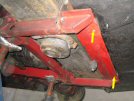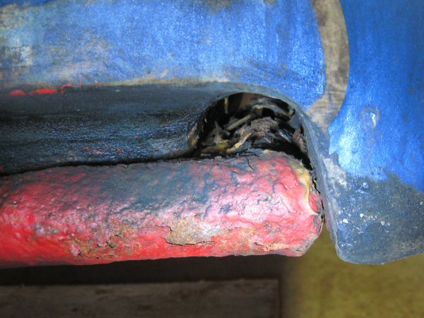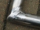 With some trepidation, I inspect the same point on the other side - but it seems to be ok, apart from the paint falling off in chunks. I put a lever in from the front, between the front of the tube and the chassis, and it seems to be pretty strong.