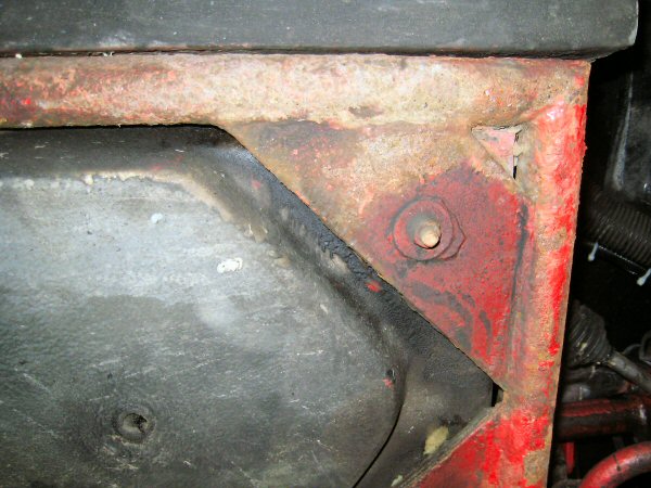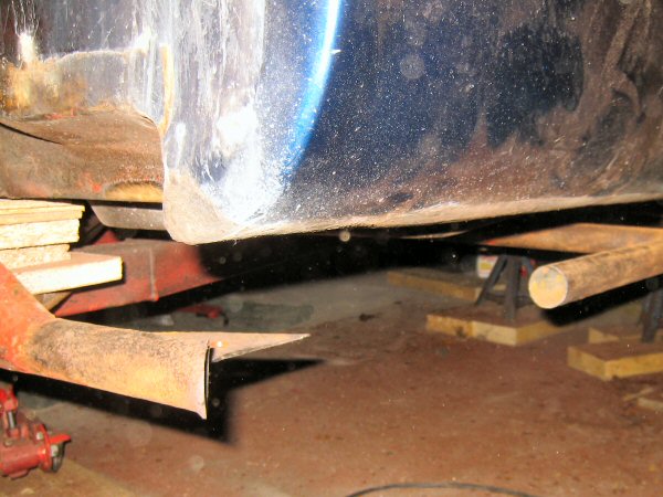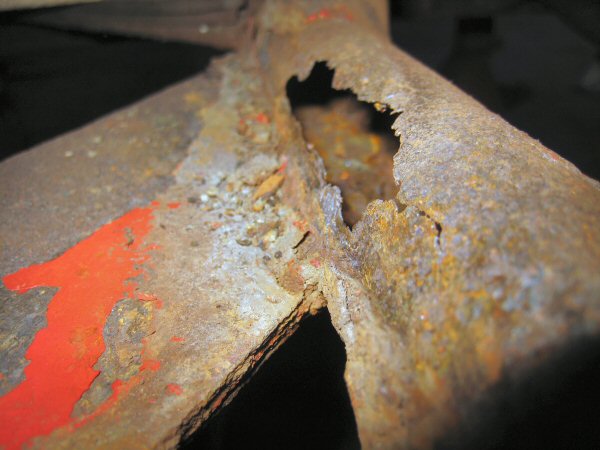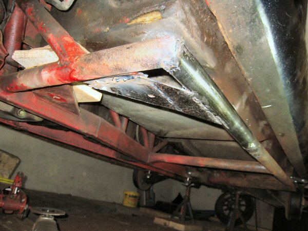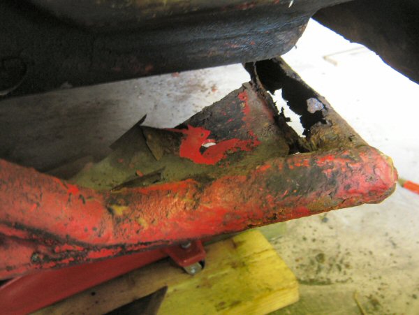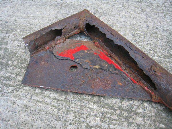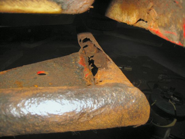 There isn't a lot left of the chassis tube alongside the body plate. The first photo shows the bottom, looking up. The second one is taken from the wheel arch, along between the tube and the body. There is virtually nothing left of the top of the tube. The body plate is held in place mainly by the body.
