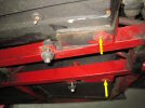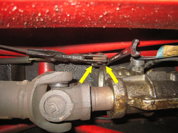 The cable fixes on to the lever spindle with a splined clamp with a pinch bolt through it. The ends of the bolt are shown by the yellow arrows here. The spanner is on the nut. There just isn't enough room to turn the spanner, I need to remove the prop shaft. No wait a minute, that's held on with 14mm bolts and I haven't brought a spanner that size (see, it's a pain this...).