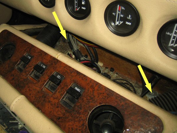 With that out of the way, the console can be pulled back as far as the gearlever will allow, and that lets you see two bolts through the transmission tunnel, shown by the yellow arrows. You can see them, but you can't get a spanner on them!