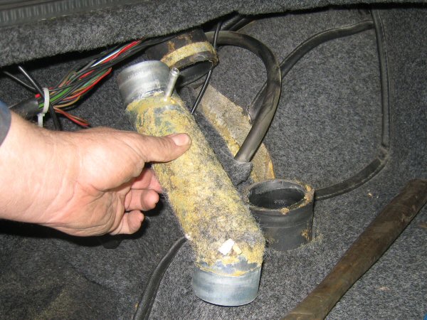 The filler is metal, with short lengths of rubber hose at the top and bottom. Disconnect the hose clips and pull the cap out. There is also a short stub for a smaller hose, which I think is a breather connected to the "carbon purge canister" - take off that clip and pull off the hose as well.