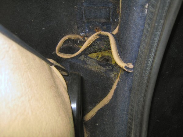 Then I lift what's left of the carpet behind the seats, and wedge a ring spanner on to the top of each bolt that goes down beside the transmission tunnel. The nuts on the bottom come off much more easily because they are out of the tyre spray crud.