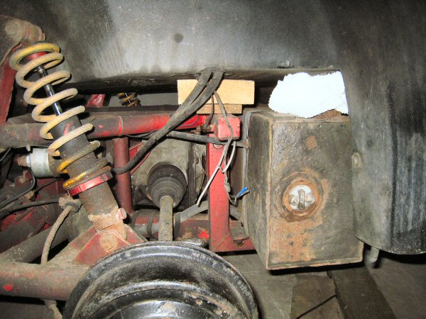 Final main item - the petrol filler. The tank is fixed to the chassis, and the cap to the body, so you have to separate them! My filler neck had been carefully carpeted, using what looked like a whole tin of evostick. It took ages to peel the carpet back off the neck to get to the hose clips.