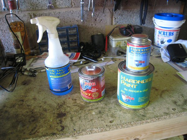 The good news is that the postman brought another parcel today - POR15 rust preventer, red topcoat, and solvent. I had the "Metal Ready" already.