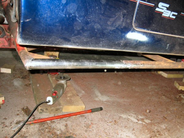 So then it's along to the garage. First job: weld that little patch into the end of the rear outrigger tube. That was easy, then I grind the welds down a bit so that the body will fit back on.