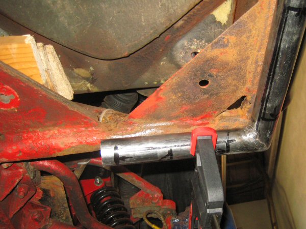 So then it's on to the right hand side. First I clamp the new pipes into place so that I can check the approximate fit, and it looks good! You can see in these photos how the front tube extends past that cross-brace, so that I have options on how to join that all up, depending how rotten the back of that front tube is.