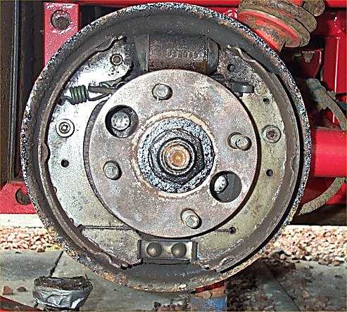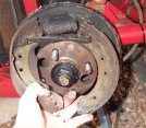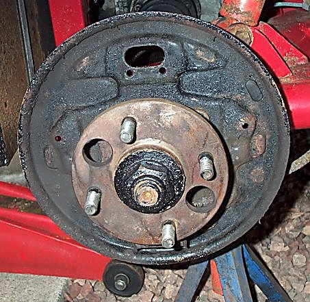 1. With the wheel off, the brake drum is held on only by friction. It should come off easily. If it's stuck on (like mine was) then careful hammering (to jolt it free) combined with careful levering between the drum and backplate did it. I also had to work around the drum levering each bit off a tiny bit at a time.