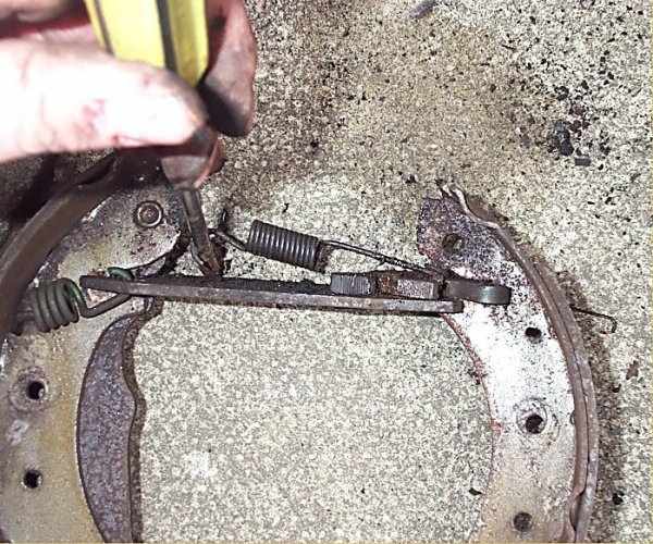 8. This is a fiddly bit! You have to lever this big spring out of the adjuster arm, then the little adjuster peg spring that is underneath it. The front shoe can be pulled off the adjuster arm at this point.