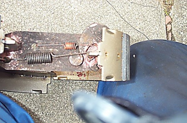 17. Now take the second-biggest spring, and hook it through the shoe from the back, then hook it through the hole in the arm as shown here. Then take the little thin spring, hook the round end over the button on the adjuster, and the other end through the other hole in the arm.. grease the adjustment pawl and mating surfaces on the other end of the arm.