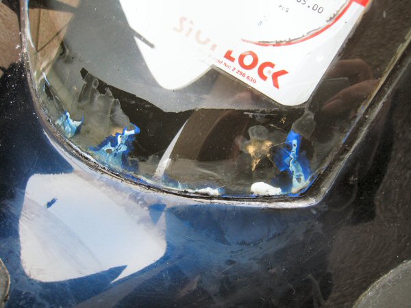 Now, attempt number 257 at sealing the edge of the screen. I bought some stuff called "Captain Tolleys Creeping Crack Cure (which I though was an ointment for piles but apparently not). There's a video on their web site that shows how it works, but basically, it's water based, you lay a bead along the edge of the crack, and it's absorbed into the crack, where it sets to form a transparent seal. I lay a bead along the top edge of the screen. It goes on like thin milk, but you can see it disappear as it runs down into a crack you can't see. I put a bead along the bottom edge, and it disappears slowly along most of the length, but over the first foot or so from the passenger side corner, it just runs away. I leave it for a bit and then put some more on - that disappears too.