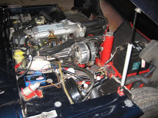 I decide to check the exhaust filler stuff I put on last weekend. It seems to have set really hard, and looks pretty good as well, so hopefully this will sort it. The instructions say that it hardens with heat, after air-drying for a couple of days, and I would rather do that before I drive it to the paintshop tomorrow. I start it up and it sounds terrible - and when I open the bonnet I find out why - I left the spark plug lead off. What a muppet. So even when I reconnect it, it's still misfiring a bit - obviously slightly flooded in that one cylinder. I don't want to rev it to clear it in case that blows the filler out so I leave it idling to harden the filler. By the time the engine is warm it sounds a lot better - still a wee bit chuffy though.
