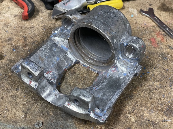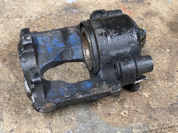 Here's the caliper after I have cleaned all of the old brake fluid out of it - the bore's ok, no scoring, although there is a matching rusty lip where the seal goes. Diagnosis - if that lips cleans up ok, the caliper itself is probably salvageble.
