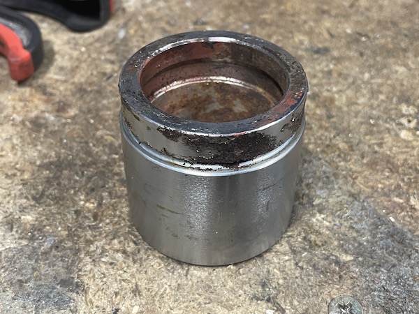 I put a bit of wood across the forks of the caliper and pop the piston out with an airline. Here's the piston - most of it is fine but the top lip (between the seal and the brake pad) is corroded and that's the bit that's sticking in the top edge of the bore. Diagnosis - fucked.
