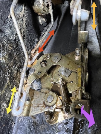 Here's the view inside the door of the re-installed lock. The yellow arrow is the door handle. The red arrow goes to the key. The orange arrow goes to the internal lock button and the purple arrow is the connection to the inside door handle - it pulls forward to open.