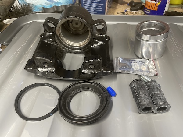 So what have we got? Well for each caliper we have a new piston, seal, dust boot, bleed nipple and cover, and new mounting rubbers. a wee pack of brake grease. And All for £17 a side!