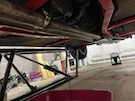 Then I get back under the car with two 17mm spanners and loosen the two bolts on the exhaust centre section. Lever it over to the left by 5mm or so and re-tighten. The silencer now has clearance on both sides, so won't rattle against the chassis.