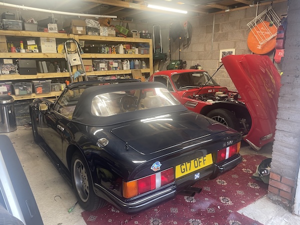 Today I am going to start cleaning the S. First I have to move the cars in the garage so that I can get the S on the left side - where it is, it's right up beside the garage wall. That maximises working space around the car that's parked on the left, but it means that you can't get in to clean the far side. So - both cars out, and I decide this is an opportunity for a photo of both TVRs together - I don't think I have done that yet!