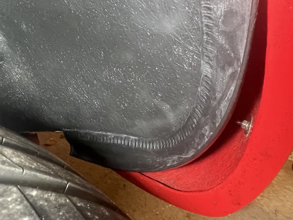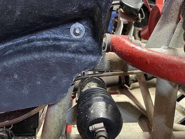 Fitting the new wing is tricker than the other side, because you have to guide it past the brake master cylinder. It fits by putting it upwards into the space, leaning back towards the chassis, and then tilting it outwards into place. Again, I have to cut a corner away for the steering rack, and mark where the chassis u-clamp has to go.