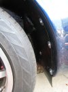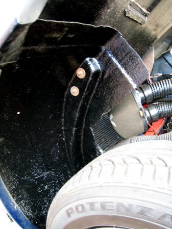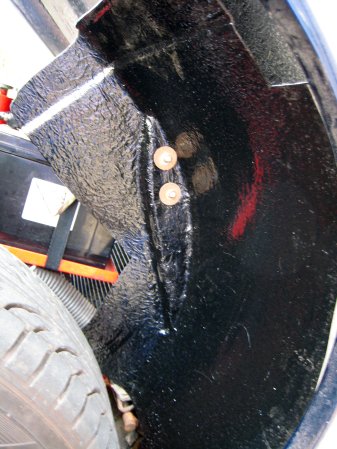 Back home, I paint the inside of the wheelarches with gloss black spray, then re-drill the mounting holes in the wheelarch (as near to the original position as I can get them).