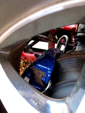 Also, while waiting for the wheelarch paint to dry, I paint the brake calipers with dark blue Hammerite (Red and yellow and black and blue, I can Hammerite a rainbow...)