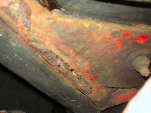 So... went out today just to have a look... everything seems ok, surface corrosion and paint chips only... then I get to the front of the nearside outrigger, just behind the front wheel, and alonside where the body plate bolts on... and there's a 4 inch crack in the paint. "Oh bother" thinks I, before deciding to give it a little poke with a screwdriver, just to remove the loose paint... and the screwdriver disappears. A few taps with a hammer and I've opened up a 4 inch gash along the bottom of the outrigger beside that mounting plate.