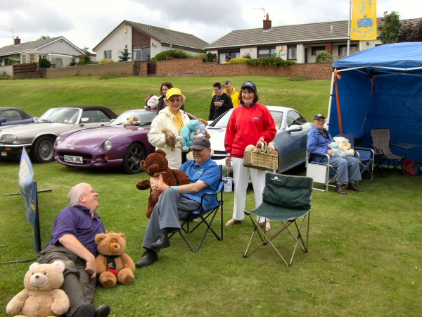 When the other bears arrive, we get the tents up and all the display stuff out, then it's down to the business of selling bears and collecting money. And showing kids around the car. It's a busy life, as you can see...