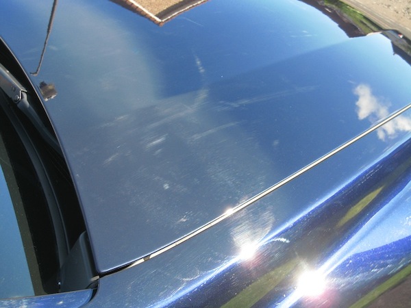 Worse than that, though, is that, in attempting to remove the one or two swirly bits that were left after their previous 3 attempts, they have polished the whole car and left the whole thing swirly. This photo shows the back edge of the bonnet and wing, and believe me, it's difficult to capture, in a photo, how bad the car looks in reality. It looks like it has been polished with a brillo pad. It's all right if it's not sunny though, or as long as I (literally) don't look at the bright side.