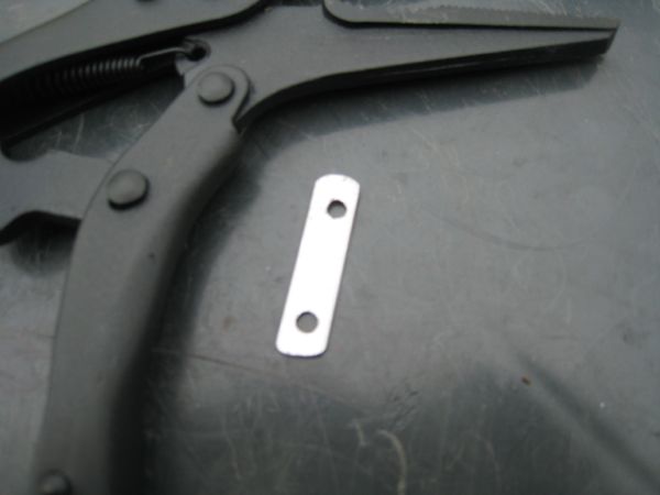 First job is to make new "tangs". I get a stainless steel hose clip and straighten it out, and clamp it to a bit of wood, and drill 4 holes in it. Then I cut the tangs out of the clip.