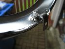 So the first step is to drill out the pop rivet and get the tang off the old one - that doesn't take long. Then transfer it to the new one and pop-rivet it on - that doesn't take long either. What happens, though, is that the chrome lifts slightly around the edge of the rivet hole, and when I try to brush it aside, it peels off in great long strips.