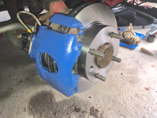 After a week where I’ve just been busy, the brake disks arrived yesterday, so I get back to the car today. The caliper paint has obviously hardened, so it’s time to put it all back together.