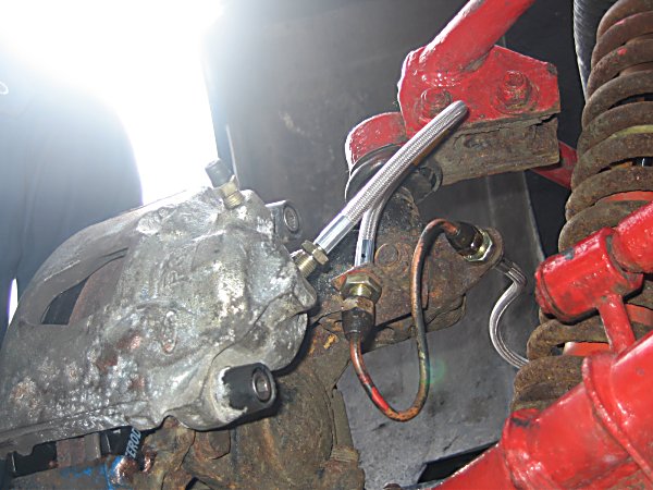 This is it from underneath - you can see the end of the long pipe, and a short metal pipe, then the braided pipe to the caliper. The dodgy connector is the one closest to the camera.