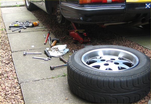And here is a rare photo of my extensive air-conditioned workshop facilities, just after I had finished. Witness if you will the fine selection of spanners all of the same three sizes, chosen carefully at random to fit between various obstructions to turning 4 sodding bolts. Notice also the inevitable hammer (if you can't fix it with a hammer, you're not hitting it hard enough...) and tin of PlusGas, the car repairer's friend.