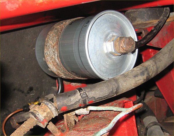 Remove filter from bracket. After much fiddling and bad words, I get the bracket off the car and the filter out of the bracket. This allows me to spin the union off the fuel pump, and an opportunity for another petrol shower.