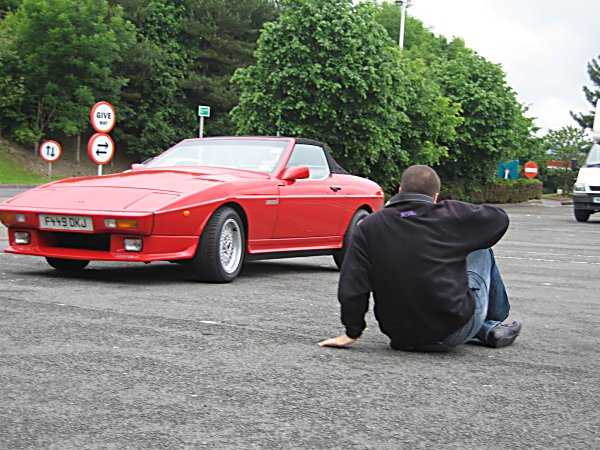 We find the (vacant) TVR stand and park up, and spend an enjoyable 15 minutes dissolving our new insect collection from the front of the two cars, and then another 15 minutes eating a couple of bacon rolls each. The rest of the TVRs (from the NE England Group) arrive at about 10:45 and park up. Some pleasantries are exchanged and then they retire into their little cabal. I admit that maybe it's me, but I was more interested in speaking to the various members of the public who showed an interest in the TVRs. Our two S types had a fair wee crowd around them and lots of people to chat to, including: