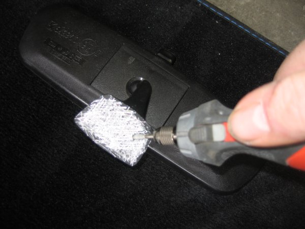 Then I rough up the back of the mirror with a dremel tool. I also use the same tool to roughen the glass on the inside, where the mirror is to stick.