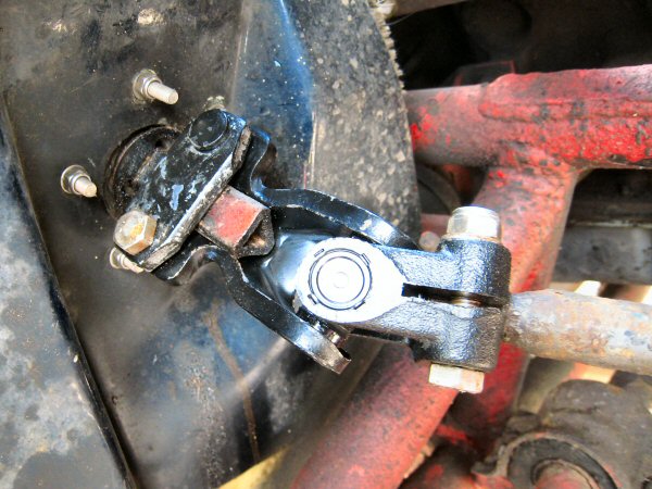 A couple of jobs to finish today. First the steering universal joint. First jack the car up and take off the offside wheel and the inner wheel arch. Remove the pinch bolt that holds the joint onto the splines on the lower steering link, then the bolt that holds the joint onto the bottom of the steering column, I'd marked mine with paint before, because it's important that you get all the bits back in the same alignment (otherwise your steering wheel is out of line when you're going straight).