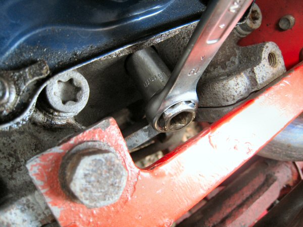 Then I jack the rear up and take the wheels off, so that I can adjust the suspension up a bit for the long journey, two-fat-bastards loaded, to S Club. While I'm at it. I spray some WD40 onto the bushes on the top and bottom of the damper. I notice that where it drips onto the swing arm, it dissolves the waxoyl. I'll remember that for future reference!