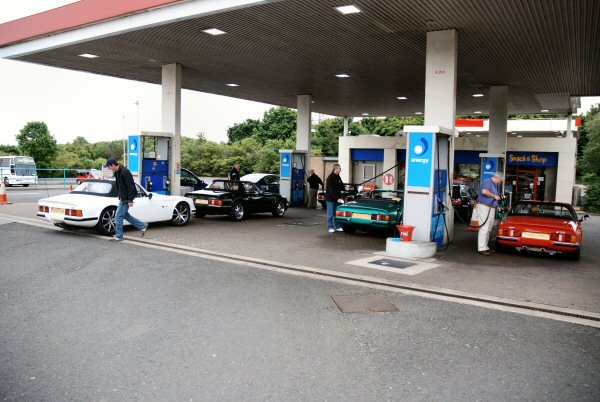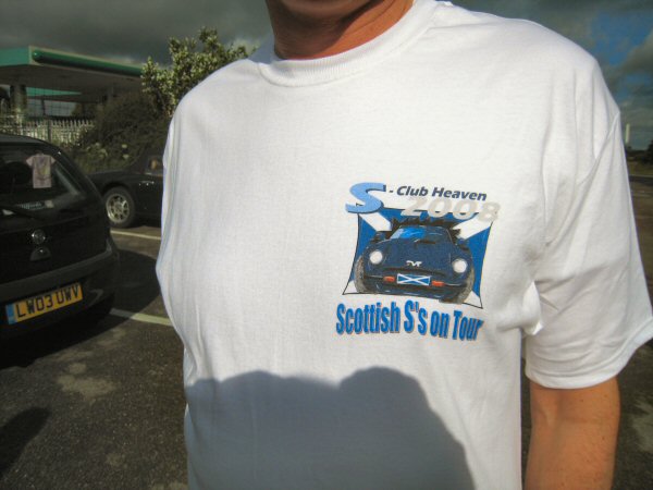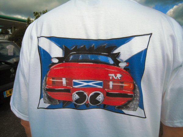 Then we distribute and put on our Scottish TVR T-shirts, modelled here by the lovely Mike and Dave, before heading over to the Little Chef.