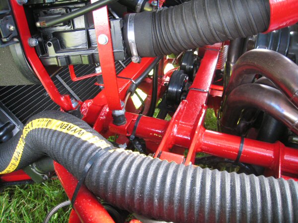 10:20 Arrive home, slightly behind schedule but still time to repair exhaust. Get trolley jack under outrigger and start to jack chassis up to provide adequate clearance for fat carcass. Wonder casually why there's a wee but expanding puddle of antifreeze appearing under the engine. Lift bonnet and investigate - it's coming from the thermostat end of a thin bypass hose to the swirl tank. I touch the hose and it erupts boiling water. The hose is split behind the clip. New priority then - no coolant equals no run to the Club meeting today.