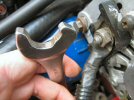 This is the bit you have be careful about. The other end of your spanner is only millimetres from the positive connector on the back of the alternator. It's live even when the engine is stopped, it's connected straight to the business end of the battery. DO NOT, I repeat, DO NOT allow the spanner to touch that terminal even for a fraction of a second, because it will earth through the spark plug body and weld itself in place. If you're lucky you'll be able to run far enough away before the battery explodes and/or the car catches fire.