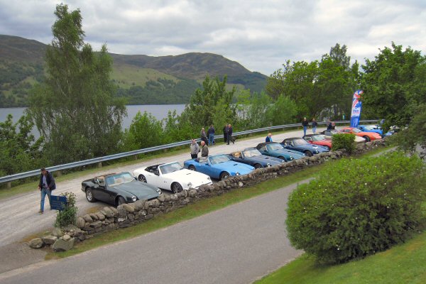 There is a stranger there who says his name is Mike, and I do vaguely remember him. He's been allowed out to play with the rough boys today. Jim and Brian also turn up so we have a convoy of 4! After the long trail through miles and miles of average speed camera where they are building the new Forth Bridge, we finally get a shift on, and arrive at the agreed meeting point near Perth, where we meet up with Hugh and another new S-boy, Fergus. We latch on to the rear of the main group as they pass, and soon catch up (it's a twisty road so the big TVRs can't use their power advantage, but we can use our go-kart advantage). Despite the efforts of one or two dawdlers, we manage to stay together all the way up the road.