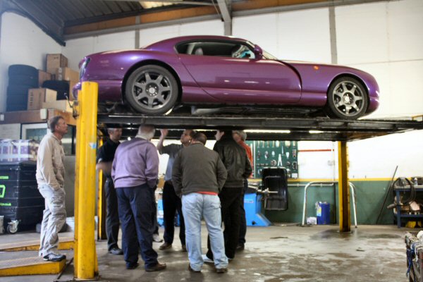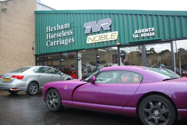 Adrian has arranged a visit to a TVR Dealer 100 miles away - the one that I take my Cerbera to. He's arranged sandwiches and a look around the workshops. Well worth a 200 mile round trip. What he hasn't arranged (and you would think he would have learned after Chatsworth) is half-decent weather. It's absolutely pishing down.