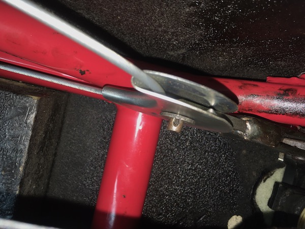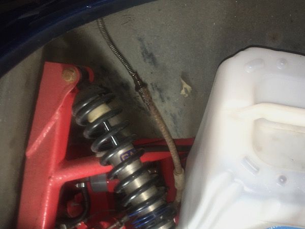 What I do notice while I’m under there, is a tiny trail of brake fluid from the connector on one of the rear flexi brake pipes. I get a couple of spanners and tighten up the connector.