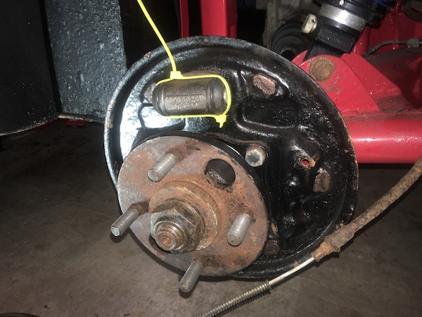 First I remove both brake drums and then disassemble the rear brake shoes from the backplate (again as per the “how-to in the menu on the left there). The yellow cable tie is to prevent the pistons pooping out of the wheel cylinders while I'm doing the rest.