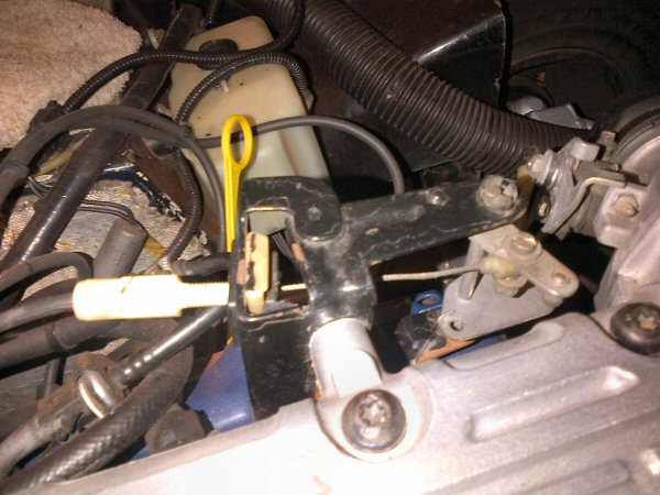 This photo shows the throttle cable, the black bit that the horseshoe clip fits into, and the plastic eyelet on the end.