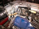 First I remove the cable from the throttle end. To do this, I remove the wee clip on the ball joint at the throttle plate, and remove the plastic arm. Then I remove the two bolts holding the linkage to the engine, and turn it over to undo the two tiny nuts holding the cable nipple on to the linkage. Then I remove the horseshoe clip and the linkage comes free. That gives me enough slack to fit the clamp at the pedal end.