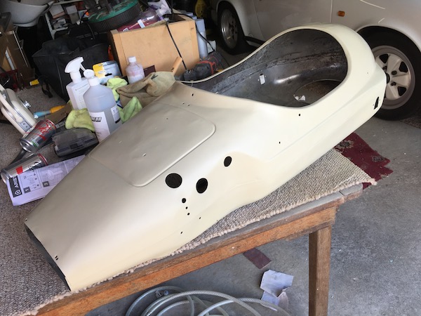The grey primer has dried, and highlights where there are still dents needing a bit more work.
