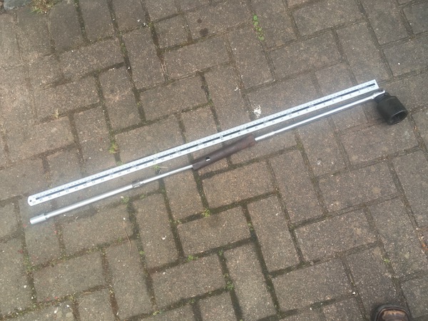 Then I fit a 41mm socket to the hub nut (after checking that it's not a left-hand thread), and fit a 600mm breaker bar to that, then a large box spanner over the handle, then two 10-inch socket extension bars locked together, into the other end of that box spanner. I now have a socket handle 1 metre long! With the hub still in the vice, and my foot against the workbench, I get the hub nut off. Easy bit!
