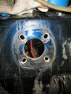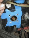 First I stick masking tape over the existing holes in the bulkhead, to give me something to mark on. Then I take the template I made, and mark through the edges of the enlarged holes - two to be elongated outwards, the other two inwards.
